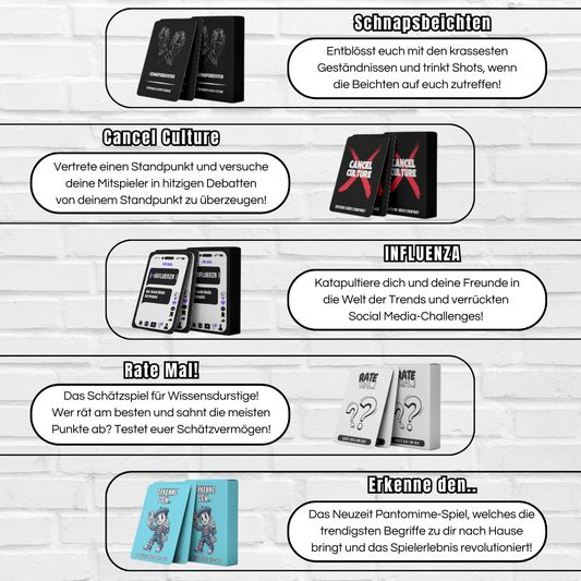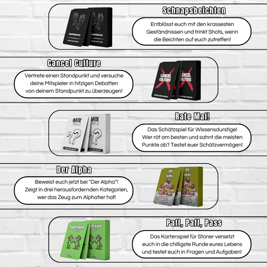 Du kannst dich nicht entscheiden? Kein Problem! Mit unserem All-in-One Bundle bekommst du alle unsere Kartenspiele und sparst dabei mehr als 180 €! Hol dir den ultimativen Spielspaß in einem Paket und lass keine Party mehr langweilig werden.