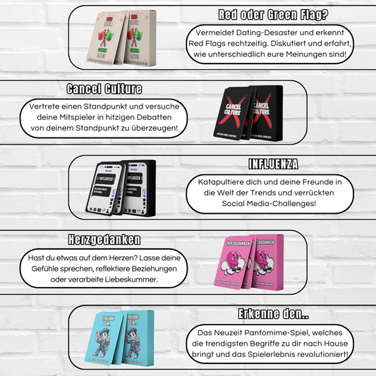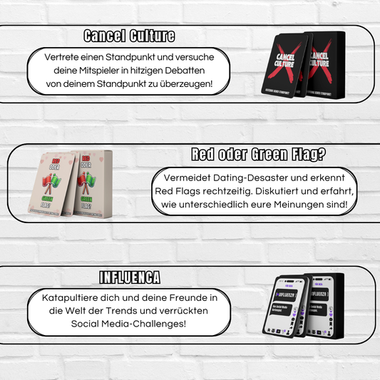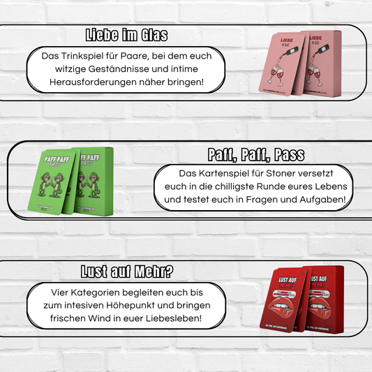 Du kannst dich nicht entscheiden? Kein Problem! Mit unserem All-in-One Bundle bekommst du alle unsere Kartenspiele und sparst dabei mehr als 180 €! Hol dir den ultimativen Spielspaß in einem Paket und lass keine Party mehr langweilig werden.