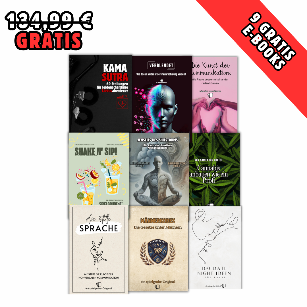 Nur für kurze Zeit bekommst du alle 9 exklusiven E-Books gratis zu deinem All IN One Spielgrube Bundle dazu! Sie sind die perfekte Ergänzung für jedes Spiel und bringen neuen Input für Partys, Diskussionen und besondere Abende.