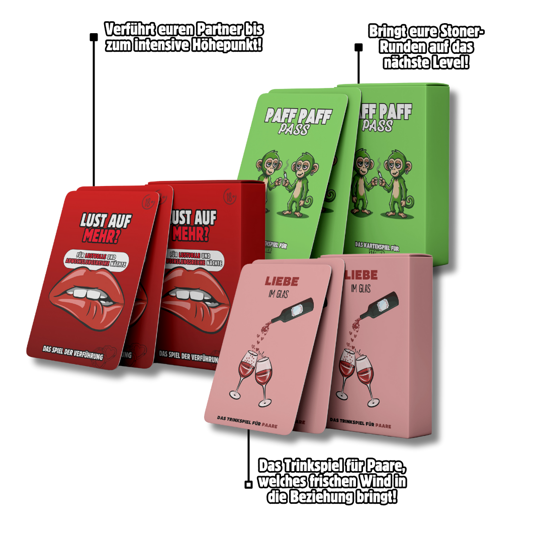 Das Lust & Rausch-Bundle enthält drei aufregende Kartenspiele und ein exklusives E-Book, die perfekt dazu geeignet sind, erst zu entspannen und dann die Sinne zu entfachen. Berauscht euch an witzigen und sinnlichen Herausforderungen, bevor ihr euch vollkommen der Leidenschaft hingebt.