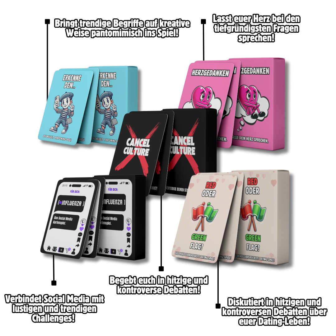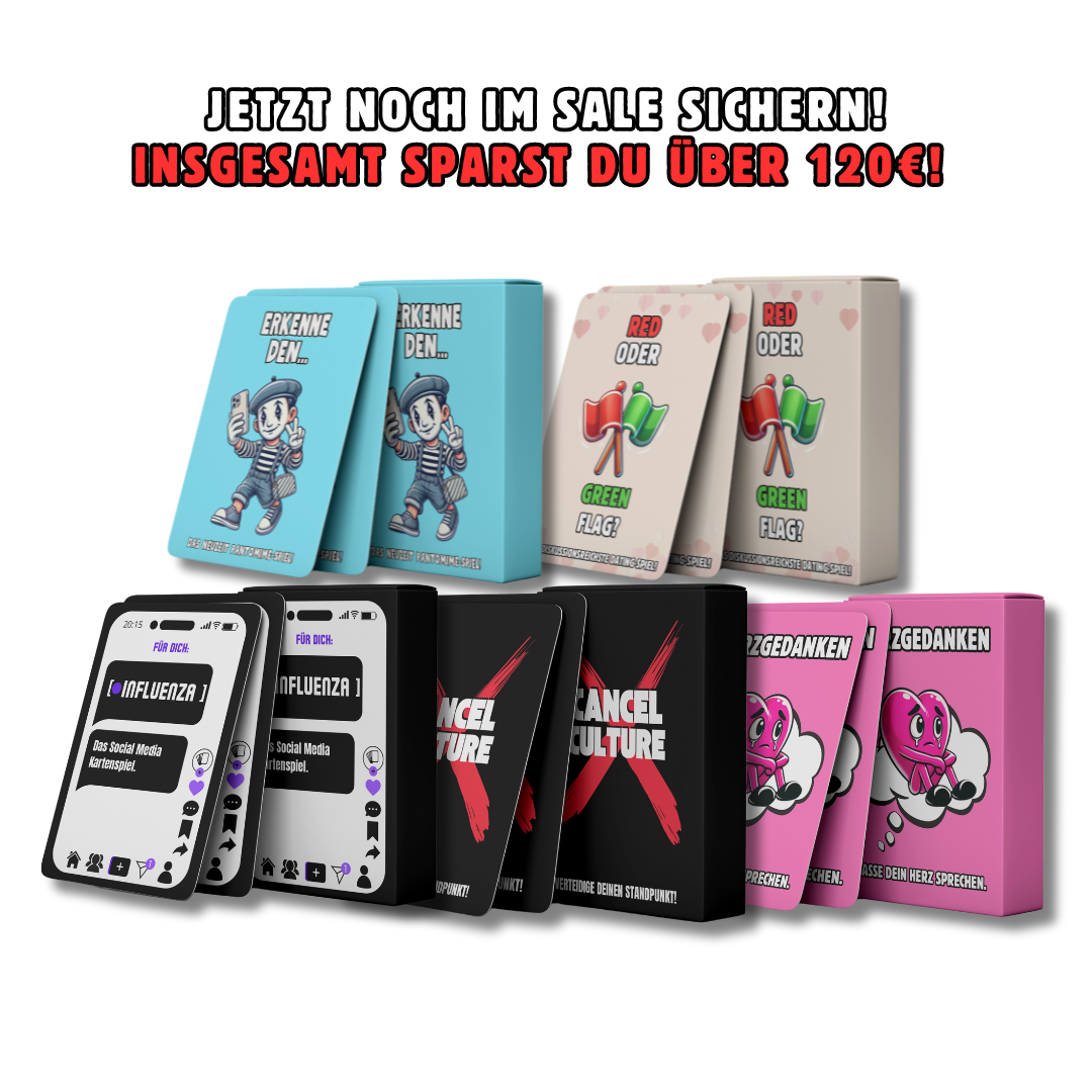 Das Mega Girlsnight Bundle enthält fünf witzige und spannende Kartenspiele sowie drei exklusive E-Books, die perfekt zu einem Mädelsabend passen. Ob Geheimnisse enthüllen, Lachen bis der Bauch schmerzt oder tiefgründige Gespräche – dieses Bundle hat alles, was ihr für eine grandiose Nacht mit euren Freundinnen braucht.