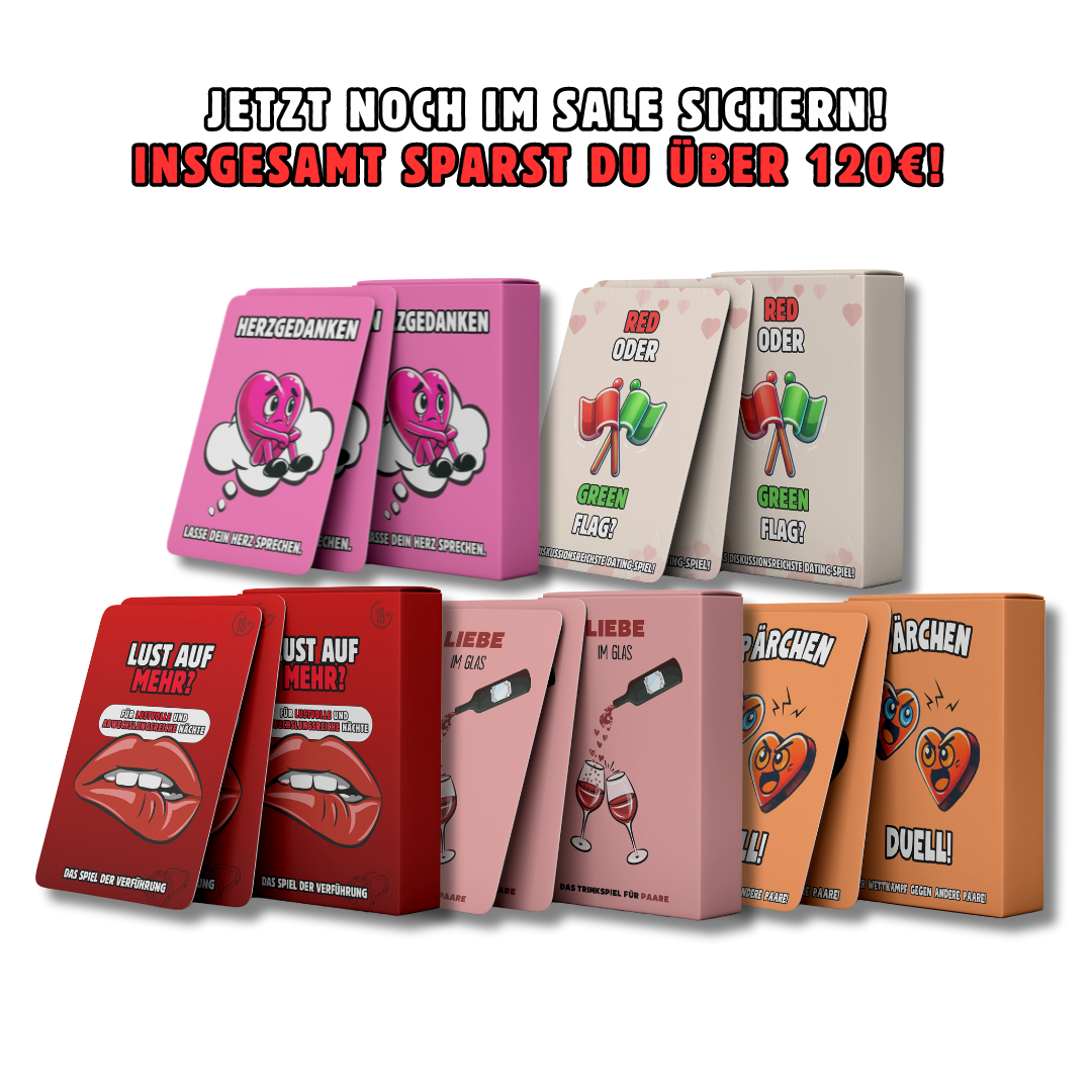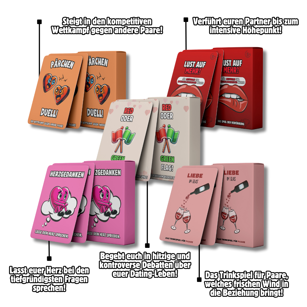 Das Mega Pärchen Bundle enthält fünf aufregende Kartenspiele und drei exklusive E-Books, die euch auf spielerische und sinnliche Weise näherbringen. Egal ob romantische Gespräche, lustige Challenges oder intime Momente – dieses Bundle bietet alles, was ihr für spannende und verbindende Erlebnisse braucht.