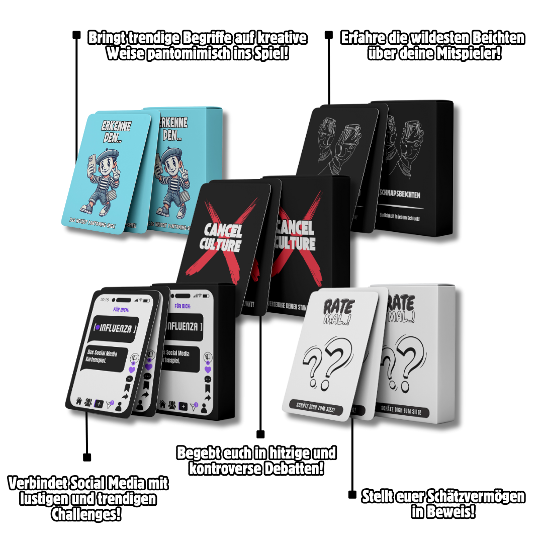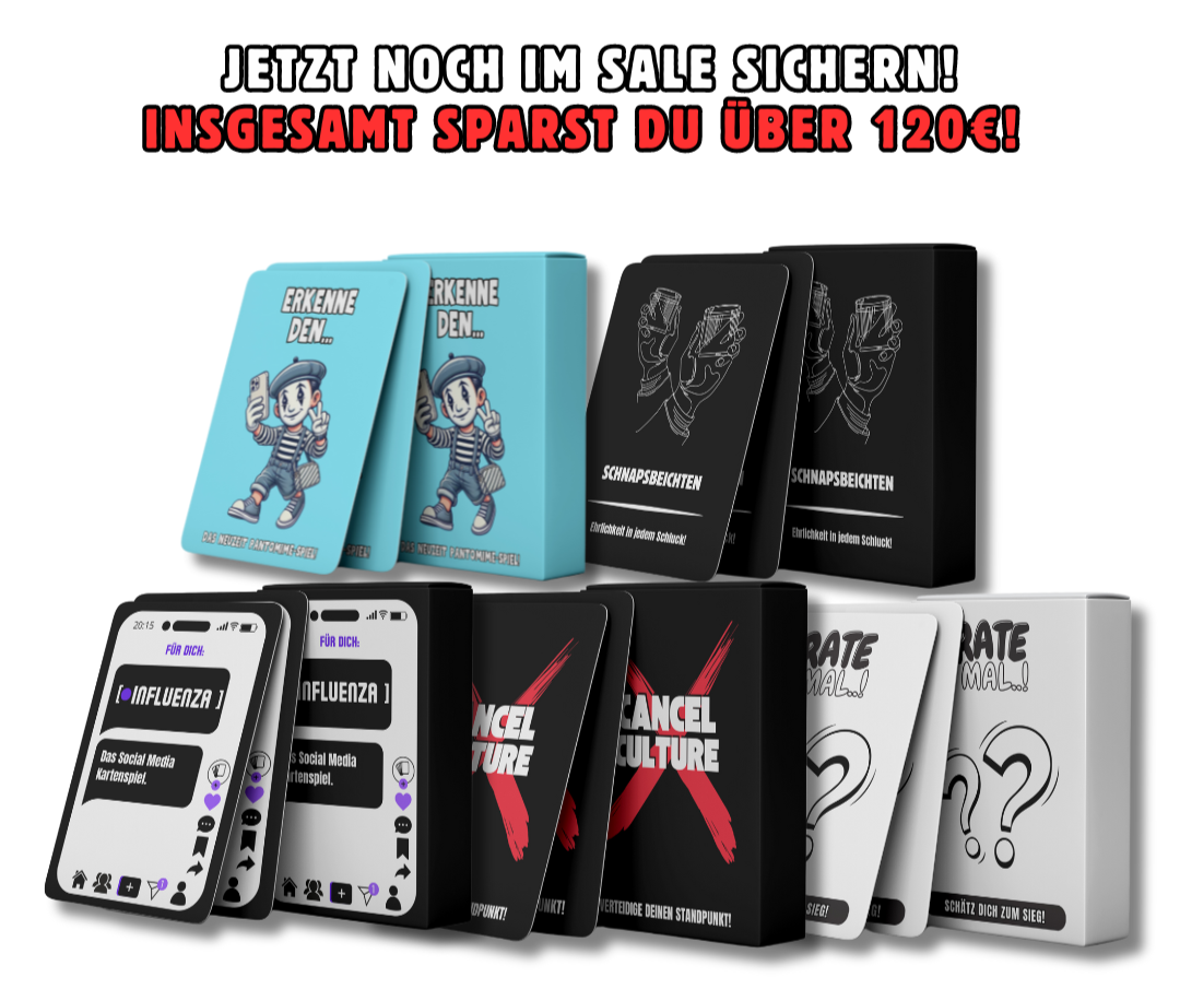 Das Mega Party Bundle enthält fünf unterhaltsame Kartenspiele und drei spannende E-Books, die für jede Menge Abwechslung auf deiner nächsten Feier sorgen. Von witzigen Trinkspielen und Social Media-Challenges bis hin zu kontroversen Diskussionen und Schätzfragen – dieses Bundle deckt alles ab, was du für einen unvergesslichen Abend brauchst.