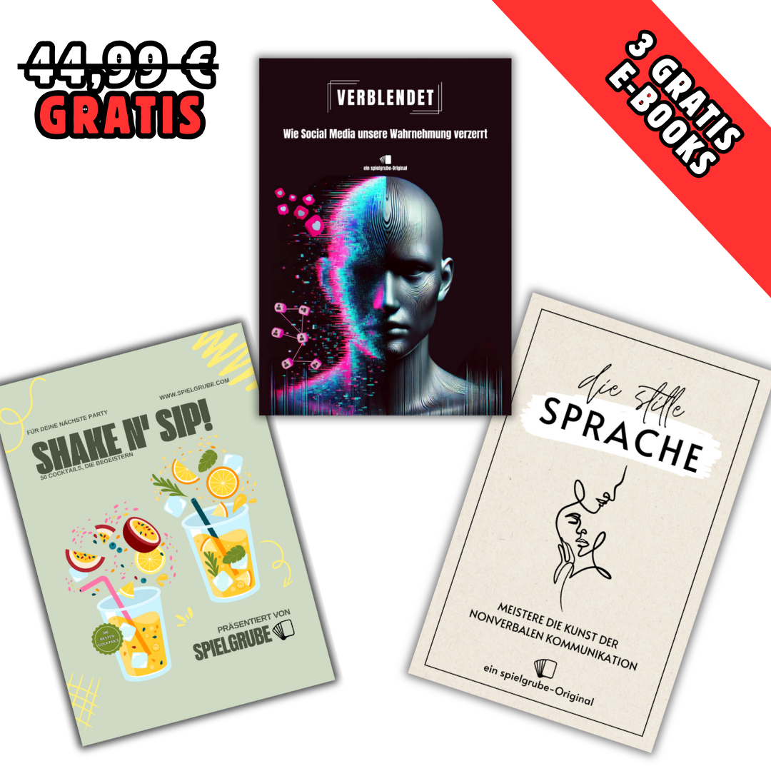 Nur für kurze Zeit bekommst du drei exklusive E-Books gratis zu deinem Mega Party Bundle! Lerne die besten Cocktailrezepte, entdecke Tipps zur nonverbalen Kommunikation und tauche in die Welt der Täuschung ein – perfekt, um deine Party unvergesslich zu machen!