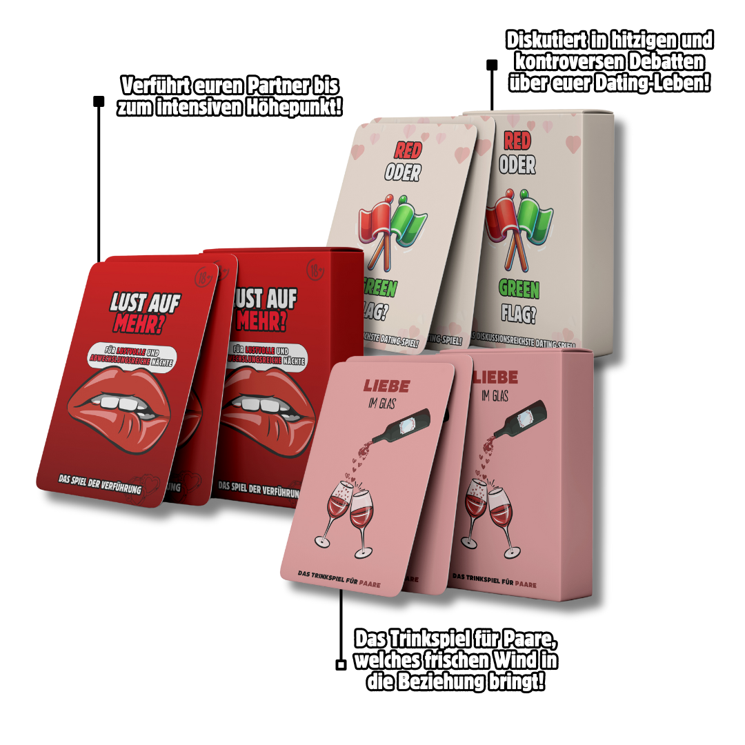 Das Pärchen-Bundle enthält drei spannende Kartenspiele und ein exklusives E-Book. Es bringt euch näher, sorgt für Lachen, tiefe Gespräche und romantische Momente – perfekt für unvergessliche Abende zu zweit.
