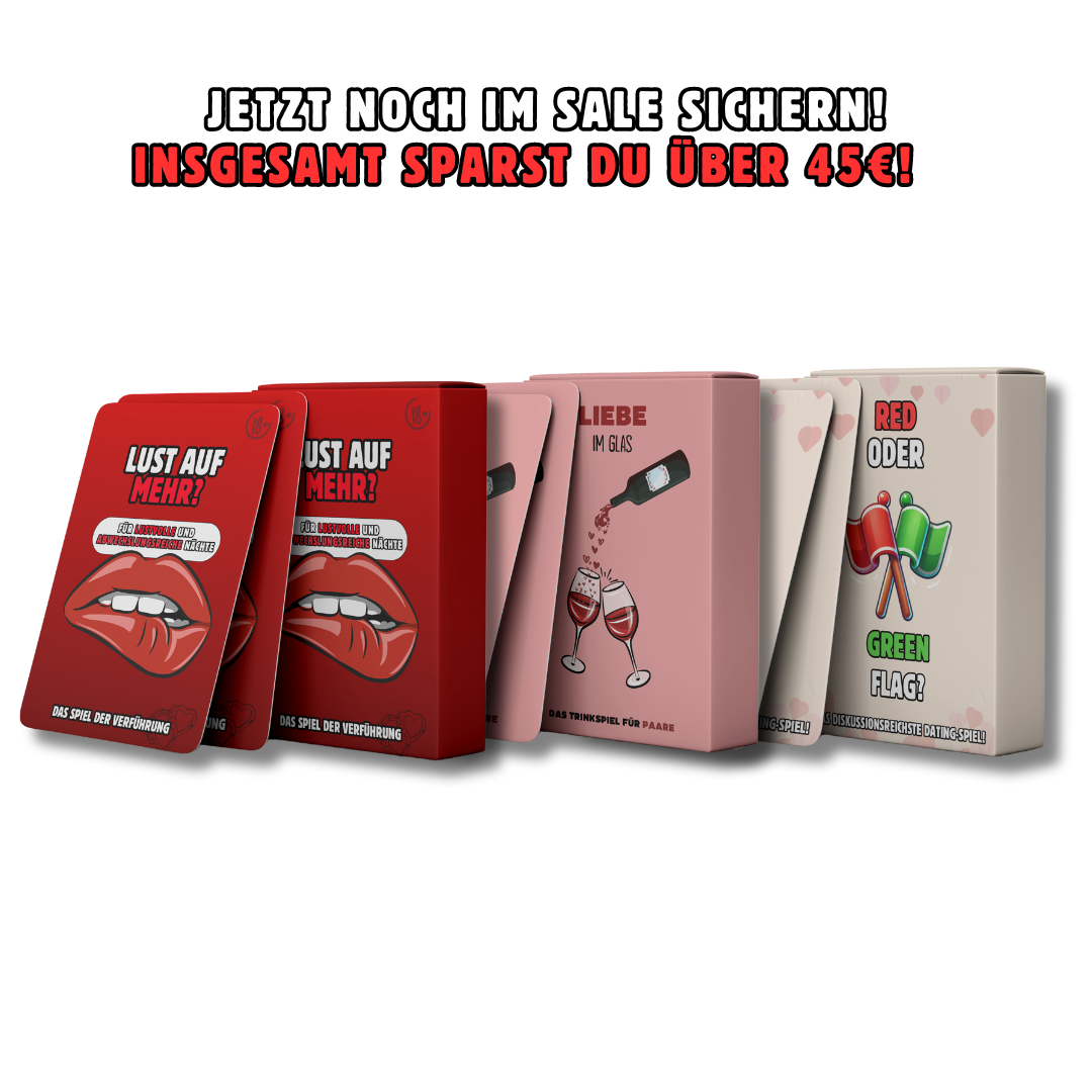 Das Angebot gilt nicht mehr lange! Hol dir das Pärchen-Bundle und sichere dir unvergessliche Abende voller Spaß, tiefer Gespräche und romantischer Herausforderungen. Verpasse nicht die Gelegenheit, bevor es zu spät ist!