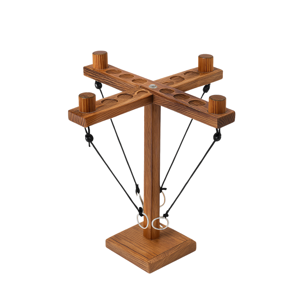 Zwei Spieler versuchen gleichzeitig, ihren Ring auf den Haken zu werfen. Trifft der Ring, wird der Mittelarm einen Punkt in Richtung des Gegners gezogen. Wer den Arm komplett auf die Seite des Gegners schiebt, gewinnt!